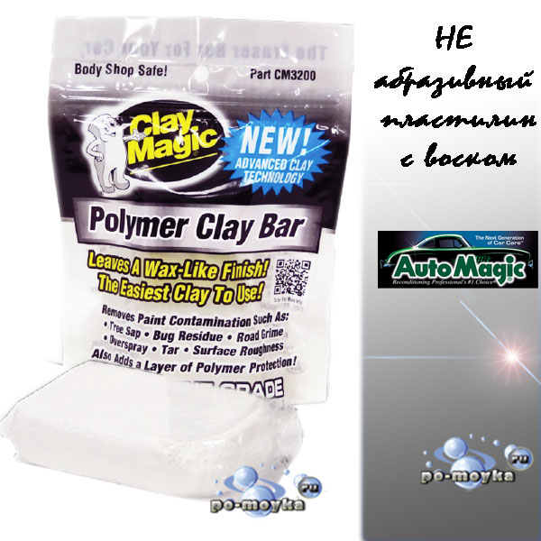 Глина высокого американского качества AutoMagic используют уже не одно десятилетие на всем земном шаре. Плитка белого пластилина CM 3200 серии CLAY MAGIC удаляет с ЛКП самой обрабатываемой поверхности грязь и придают ей реальную защиту. Как правило эту автомобильную глину белого цвета используют в автосалонах и автомастерских для устранения оставшейся грязи после транспортировочной плёнки, гудрона на новых машинах. Сам пластилин Polymer Clay Bar после применения оставляет на поверхности защитный слой, который имеет эффект водоотталкивания (принцип как у жидкого автомобильного воска). Продукт Polymer Clay Bar очищает и удаляет поверхностные загрязнения (промышленные выбросы, остатки от тормозной пыли, капли цемента, смолы и соки с деревьев, следы мошек), а вдобавок еще и немного "заполировывает” обрабатываемый участок. В цехах по работам восстановления кузова автомобиля CM 3200 будет необходим перед полировкой (финишной).