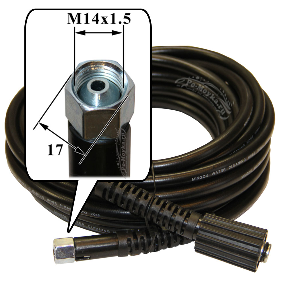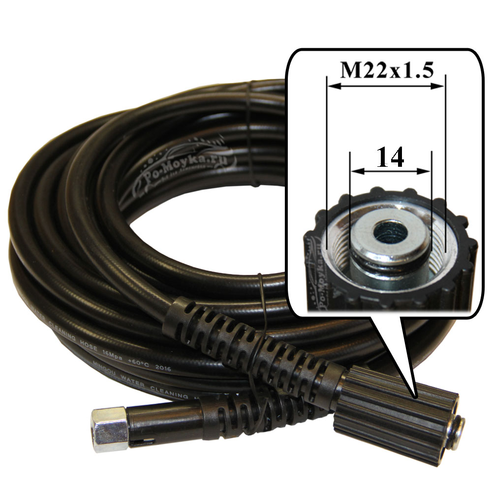 Шланг высокого давления 10 метров MG02 для бытовой минимойки Sterwins, Прораб, Elitech, Hammer, Champion, КНР, и опять же надо уточнять к какому другому аппарату подойдёт. Мы считаем такой шланг универсальным – потому как многие компании по производству минимоек сейчас комплектуют аппараты именно китайскими аксессуарами со своим типом крепления, и как оказалось они подходят к многим минимойкам. Просим и Вас по возможности сообщать нам, на какие мойки с таким размером может подключиться без проблем как к пистолету, так и на АВД наш шланг. Наверняка этот рукав подойдёт на Sturm, Robinzon, Интерскол (проверяйте размеры пожалуйста). Внимание, просьба обратить внимание на крепление шланга: с одной стороны Гайка М22х1,5 (штуцер 14 мм), с другой стороны шланга Гайка М14х1,5 (со штуцером под конус).