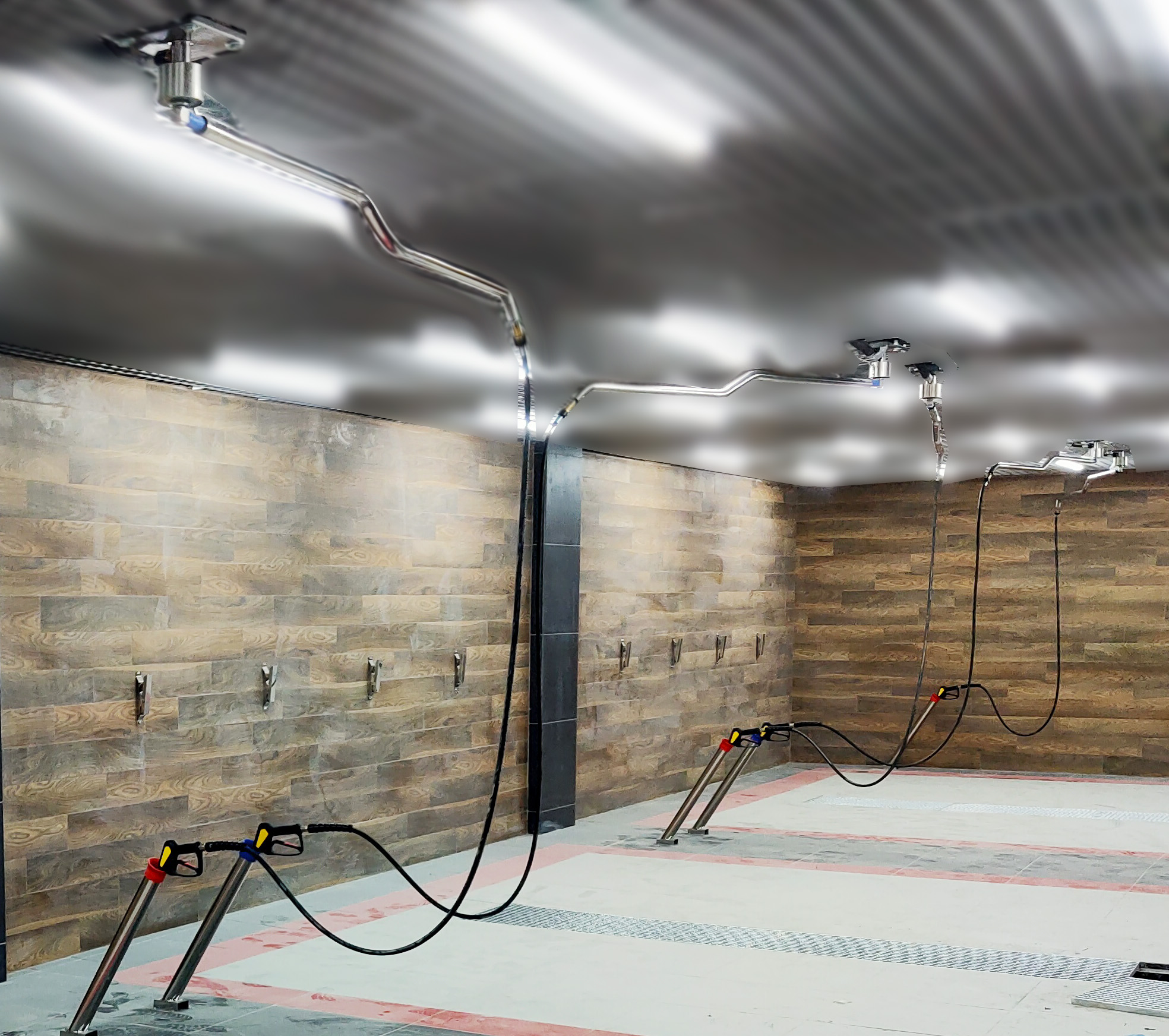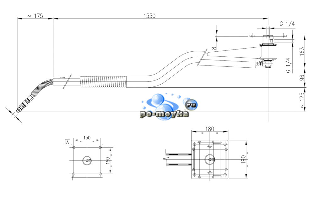 Консоль на автомойку из нержавеющей стали, которая оснащена подъёмными воротами. Многие устанавливают раздвижные вверх ворота для въезда в моечный бокс автомобилей, и их крепление впоследствии сильно мешает монтажу и работе потолочной консоли. Существует альтернативный выход – купить изогнутую консоль на 2 метра, которая позволит без дополнительных проставок и элементов пользоваться ей при наличии раздвижных ворот на мойке. Хитрость конструкции состоит в том, что она понижается после 80 см от основания вниз на 0,1 метра (чего вполне может хватить как раз для элемента крепления ворот). Сама консоль потолочного типа послужит уменьшению временных затрат на мойку, увеличит надёжность РВД шлангов и минимизирует силы на отбивку грязи с авто мойщику.На мойках самообслуживания необходимо иметь именно такой конфигурации потолочные консоли, они не пересекаются между собой. К одной из них будет подходить пена низкого давления, а ко второй вода для смывки грязи и химии с кузова. Подключаемая часть к консоли М22х1,5 штуцер, выход с консоли также М22х1,5 наружная резьба с вращение (фитинг установлен).