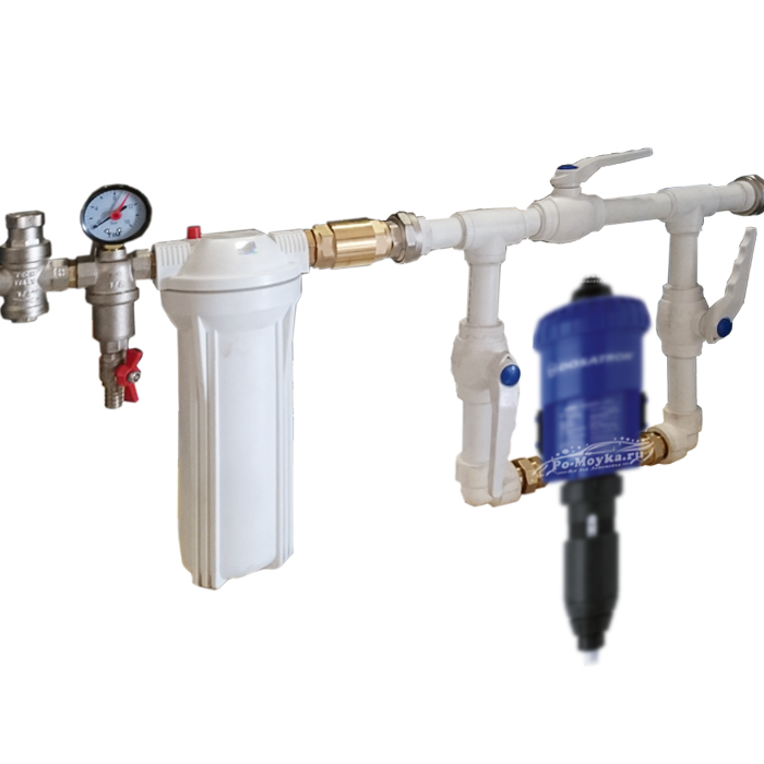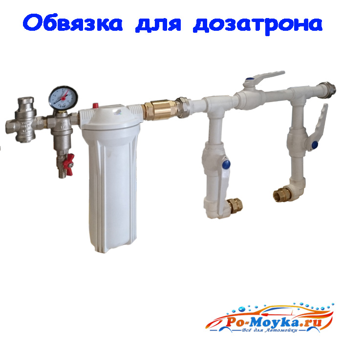 Долговечность и качественная работа дозатрона зависит не только от подачи воды в требуемом количестве под необходимым давлением, но и Ваша система водопровода должна иметь некую “обвязку” состоящую из различных доп элементов низкого давления. Именно обвязку, не то что рекомендуем, а продаём в паре с любым из дозатронов – Китай или Франция не принципиально, просто это первая защита устройства для подачи химии к пистолетам на автомойке. Вот Вам яркий пример, из-за чего обвязка нужна: при расположении не одного, а нескольких дозатронов и поломки одного из них потребуется перекрыть входящую воду для снятия, при включении воды без обвязки у Вас начнёт просто литься вода мимо и остальные дозатроны перестают работать, а при расположении обвязки происходит “обход” и система продолжит нормально работать даже без одного дозатрона. Опять же в обвязку входят манометр и регулятор, по которыми добиваемся необходимого давления воды для чёткой работы дозатрона. Здесь приведена примитивная обвязка, но мы изготавливаем более сложные по договорной цене.