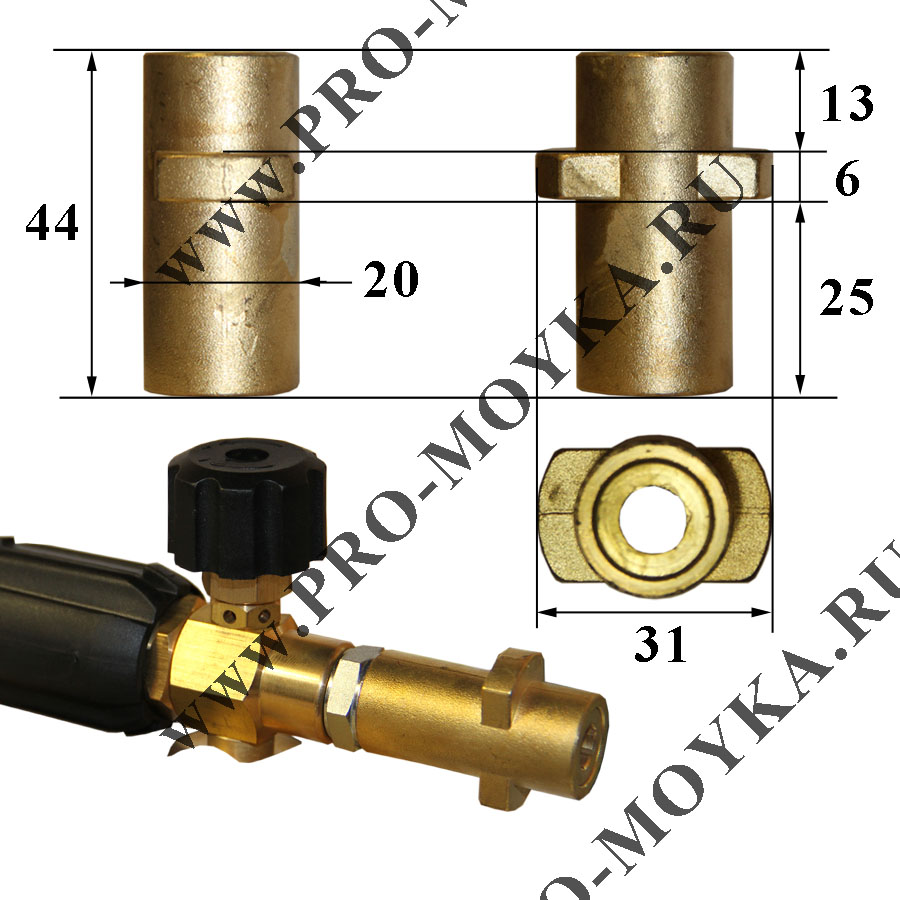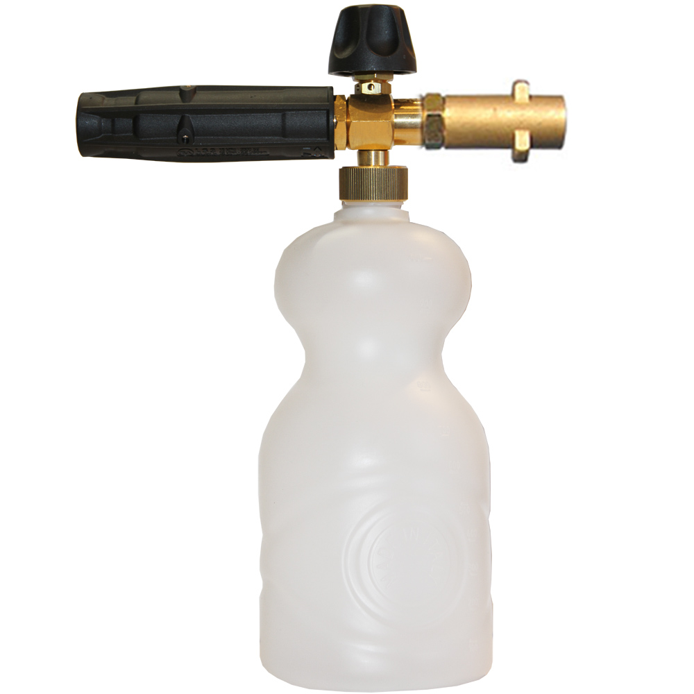Плюсы от пенной насадки на Керхер от PA Srl (Италия): Автомойска "Керхер" используется для бытовых нужд, либо в бизнесе на первых порах, и лучше купить изделие итальянского производителя. Инжектор (второй регулировки) позволяет варьировать пенную концентрацию, тем самым регулируя потребление самой насадкой №2 наносимого химического раствора. Густая насыщенная пена работает безукоризненно и смывает грязь, не повреждая кузова авто. Доступность регулировки площади охвата струей ─ от широкой лопатки и до точки. Поток воды под большим давлением, протекая через пистолет, высасывает за счёт разрежения из баллона заданное при помощи регулировки инжектора количество пены. Его регулировка влияет и на расход моющего раствора. Конечный эффект пенообразования достигается особой сеточкой-таблеткой (поставляется в комплекте). Как раз она и размельчает поток химраствора на мириады микроскопических пузырьков, которые, разрушаясь, растворяют и удаляют грязь. Объемистый баллончик (1л) для химраствора. Основание пеногенерирующего участка насадки выполнено из латунных сплавов, с добавлением нержавейки. хвостик пистолета сделан из латуни, не пластмассовый. Со временем он может повредить механизм пистолета.