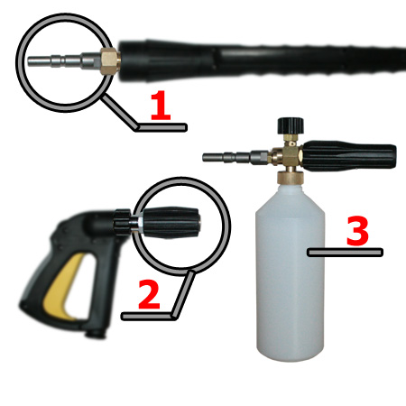Если у Вас мойка профессиональной серии, к примеру, Karcher, Портотехника, Вап, Lavor, Альто, Нилфиск, Huter, Бош или Kranzle, но нет быстросъёмной замены насадок (пенорспылителя на копьё) потребуется его купить.