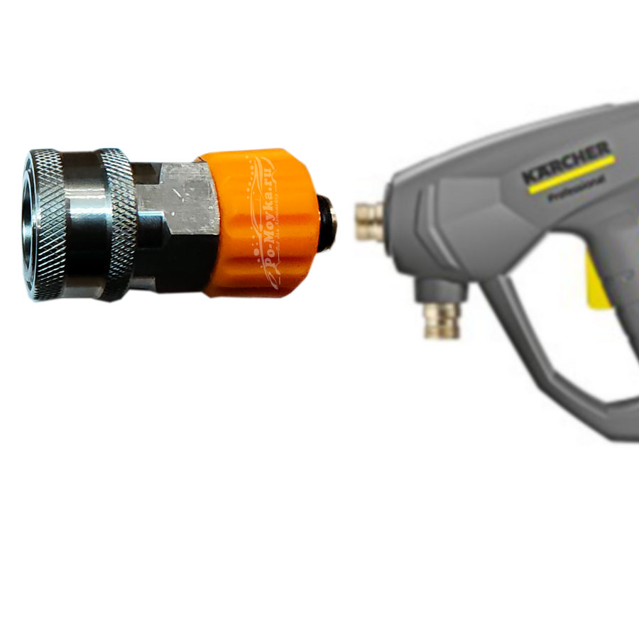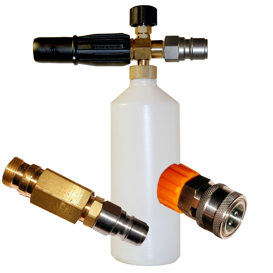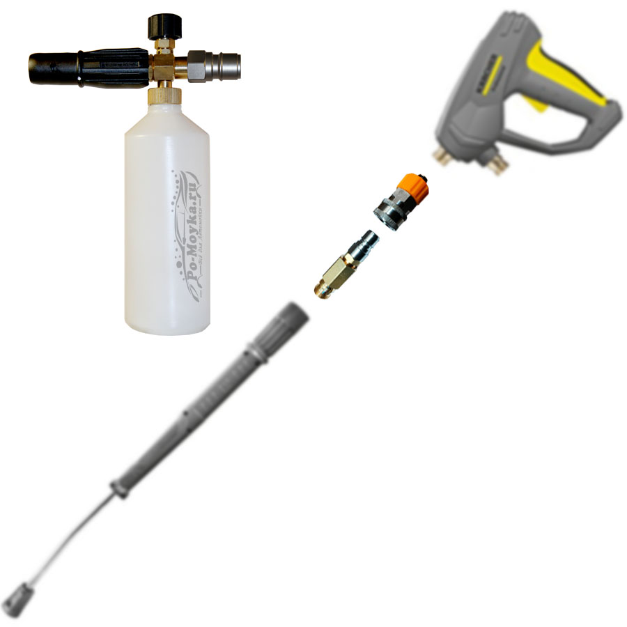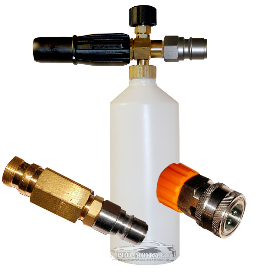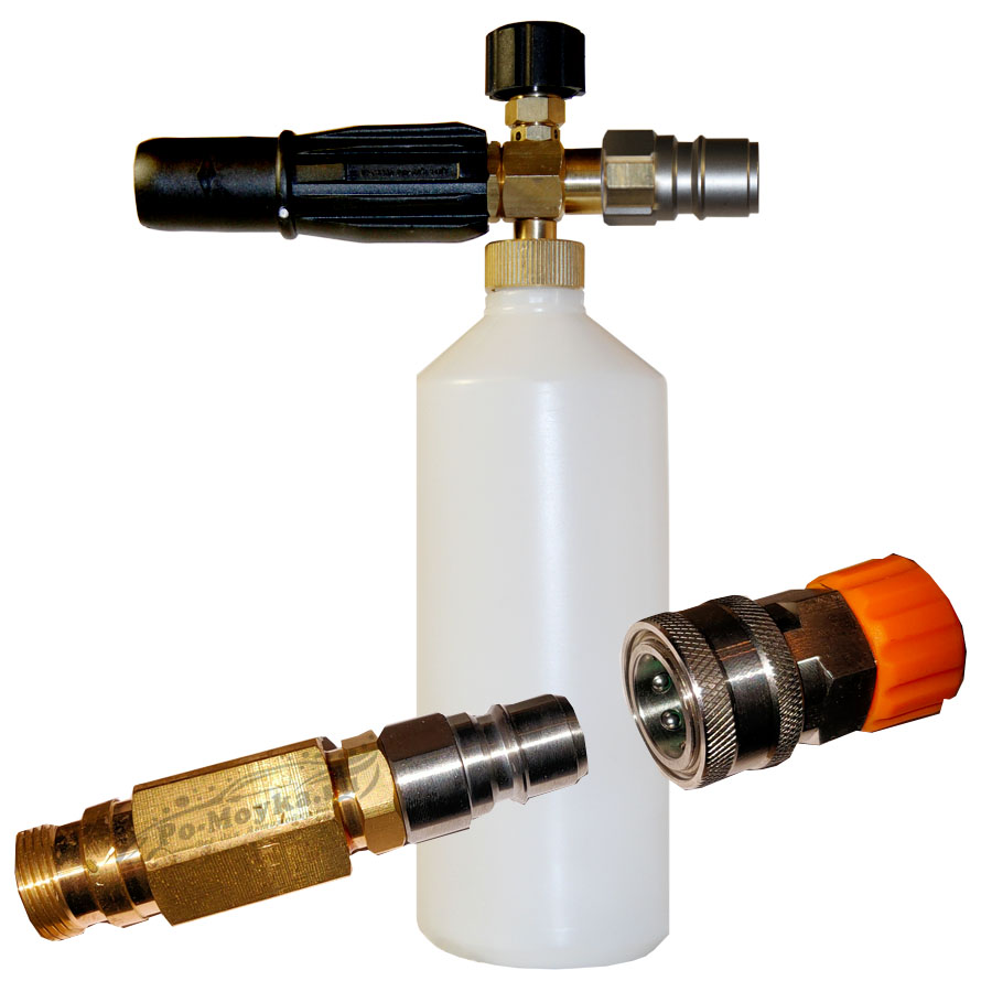 Автомойка Керхер проф серии (соединения EASY!Lock) без использования губки и быстрая замена копья на пенную насадку. Пенный набор под Karcher от компании Idrobase (быстросъемные ARS 350), набор №6. Сам набор №6 под пену на Karcher состоит из двух типов быстросъемных ARS 350 с высоким давлением и пенных ниппельных насадок РА + пенная насадка (пистолет и копье не входит в комплект, они уже есть у Вас оригинальные). Быстросъемы входящие в комплект и пенник: Байонет АРС 350 с входом EASY!Lock (внутренняя резьба) соединяющийся посредством гайки, которая крепится на пистолете с высоким давлением. 2. Ниппель РА, который закрепляется на пике или копье с наружной резьбой EASY! (который вкручиваете в пику) 3. Насадка для пены с использованием ниппеля РА (ARS 350).БРС соединения обеспечивают легкое произведение быстрой замены насадки для пены копьем с высоким давлением на аппарате Керхер с новым креплением EASY!Lock (если на пистолете штуцер EASY!, а на копье гайка с той же резьбой - это точно есть на автомойках KArcher серии HD, HDS после 2018 года выпуска). Другими словами, пользователь продолжает использование штатного пистолета и копья от аппарата, и скручивание заменяется быстрым съемом. Набор пенный Китайского производства для профессиональных АВД таких типов, как Керхер, №5b используется при нанесении разных видов химии при помощи автомобильной мойки.