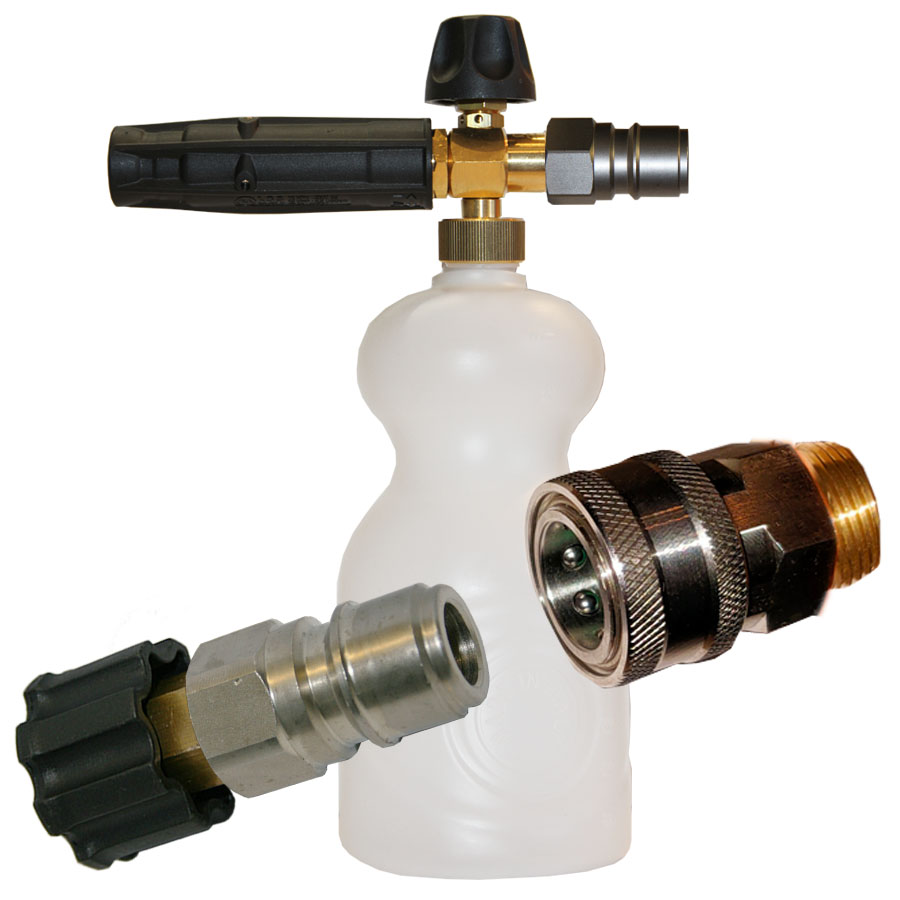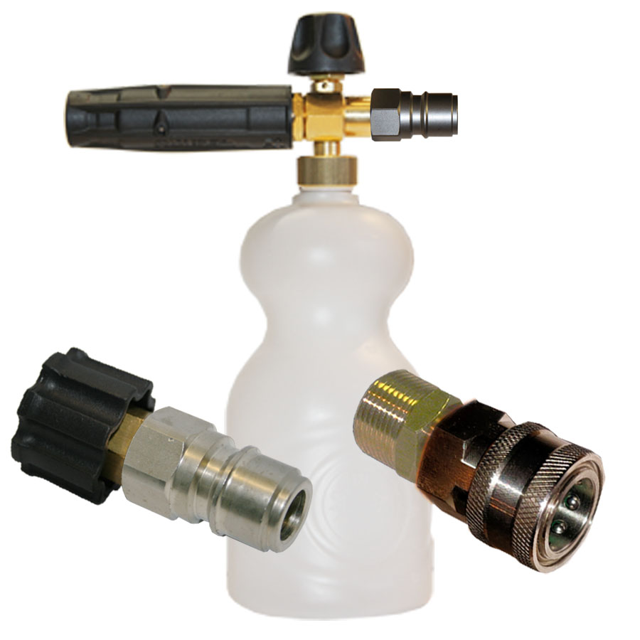 В пенный комплект 3"A" (все Италия и пенник и переходники) включены: пенообразующая насадка с ниппелем РА, быстросъемы высокого давления ARS 350 (PA) (два типа). С помощью быстросъемных переходников возможно с легкостью менять пенную насадку на копье высокого давления – то есть работа по-прежнему проводится путём смены пенообразователя на струйную трубку, но вместо скручивания и последующего закручивания аксессуары просто снимаются и надеваются. Пенообразующий набор итальянского производства под АВД профи серий вроде Нилфиск, Портотехника, Альто, Вап, Комет, Крензл №3а применяются для того, чтобы при помощи пенных автомоек можно было наносить химические средства различных типов. Находящийся в комплекте пенообразователь позволяет отрегулировать шапку до состояния густоты, которое будет в работе наиболее удобным и вплоть до эмульсии. Наносить можно щелочь или нейтральную жидкость – для обрабатывания кузова авто, санобработки применяют кислотные составы.