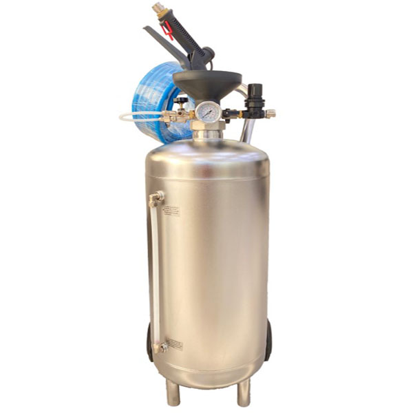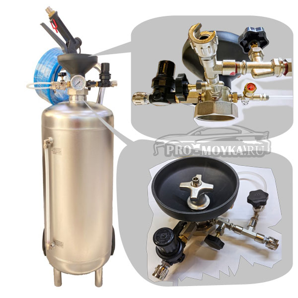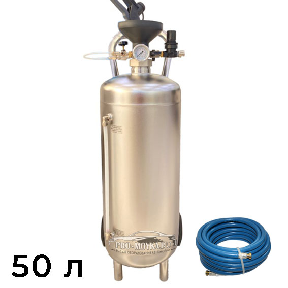 Выпустив в своей линейке 50-ти литровый пеногенератор он упрочил позиции по предлагаемому ассортименту данного оборудования во всём мире. Для его нормальной работы от Вас потребуется наличие компрессора, который должен РОВНО выдавать от шести до восьми атмосфер (без сбоев), иначе получиться что вместо пены на выходе будет то мыльная вода, то густые хлопья и сам генератор будет постоянно дёргать. Отличное исполнения бака - толстая сталь, надёжная горловина с пробкой, мощные колёса для транспортировки в залитом состоянии по территории самого пеногенератора.