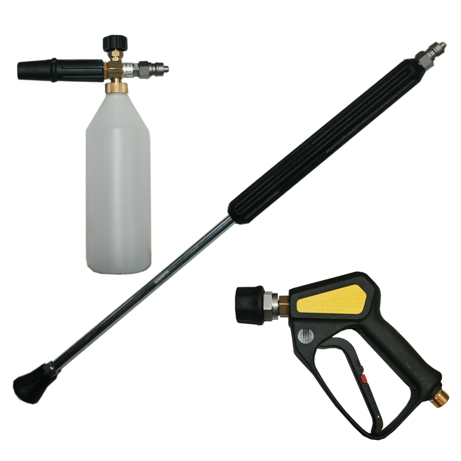 Пенокомплект для бесконтактной мойки немецкого производства R+M 001 предназначен для обработки различными видами химических средств при помощи бытовых или профессиональных (промышленных) автомоек. Использование подобного высококлассного оборудования призвано максимально сократить затраты времени и денег на мойку. В состав данного пенного комплекта R+M входит БРС Suttner (БРС KEW), вследствие чего имеется возможность провести быструю смену пенной насадки на копье высокого давления. Пенная насадка также поставляется в комплекте и обеспечивает как создание и нанесение густой пены, так и эмульсии. Как правило, при использовании насадки применяют кислотные жидкости для сан обработки или же нейтральные/щелочные для мойки кузова автомобиля.