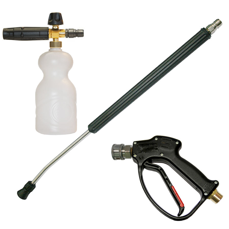 В полный комплект 25.1525.60 от PA Srl входит: Быстросъемный пистолет высокого давления RL 26 с байонетом ARS 220 вход М22х1,5 штуцер; Пенная насадка с ниппелем PA (с баллончиком на 1 литр бесконтактного химического агента и сеточкой); Копьё высокого давления с ниппелем PA длиной 500 миллиметров.