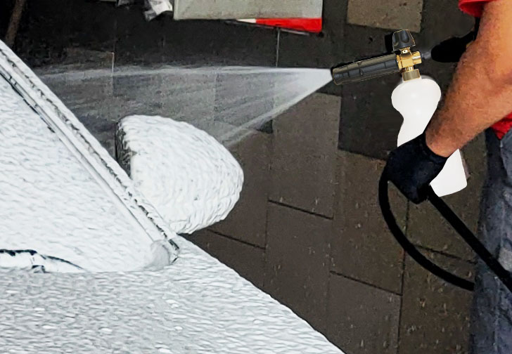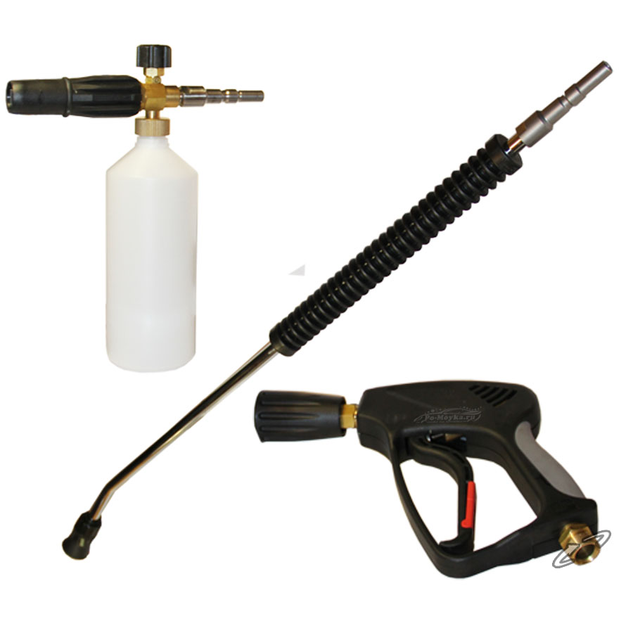Не каждый пенокомплект имеет вращение у соединения со шлангом высокого давления. Именно этот TOR-вский пенокомплект с копьем 600 мм и быстросъемами типа KW имеет заветное вращение у соединения со шлангом высокого давления. Пенокомплект для автомойки и бесконтактной обработки различных поверхностей может быть установлен не только на профессиональный АВД, но и будет работать с бытовой мойкой (не без нашего вмешательства). Для подключения бытового аппарата именно к такому комплекту мы можем дополнительно перепрессовать рукав Вашей минимойки (и будет всё работать). Этот недорогой комплект KW для бесконтактной мойки служить будет, не так долго, как например немецкий или Итальянский (опять же из экономических реалий, можно тут немного сэкономить на оборудовании). Длина копья 600 мм, что даёт возможность без проблем мыть джипы. Быстросъёмы типа KW (он же ARS 25) на курке, стволе и насадке экономят время на смену вида мойки: пенная обработка или смывка