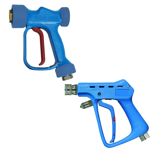 Пистолеты на низкое и среднее давление, используемое в пищевой промышленности, имеют особенности по качеству задействованного материала. Так, курки RB от PA или же ST от R+M проходят все проверки и имеют право участвовать в моечном процессе на заводе производимой пищи (мясокомбинат, хлебозавод, молочная фабрика). Курок должен иметь не только безопасный материал, позволяющий использоваться при смывке, размывке или очистке, но и выдерживать большую производительность. Выбирайте, какой пистолет лучше купить RB 65 и RB 35 (PA Srl) или ST-2725 и ST-3100 (R+M). По техническим характеристикам пистолеты рассчитаны на максимальные 24 Бар или до 80 Бар, а вот по производительности максимально возможно пропускать 100 литров в минуту (такие тех данные имеют хорошие промывочные машины и мощные насосы).