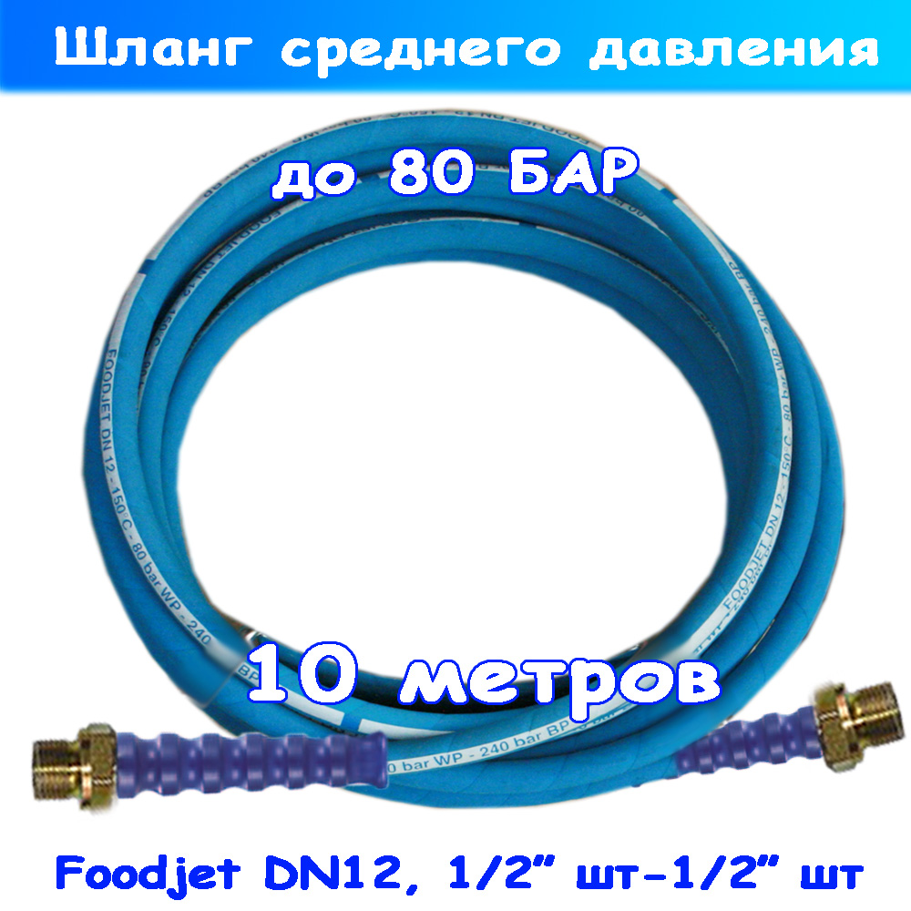 Шланг среднего давления пищевой Foodjet (до 80 Бар) длиной 10 м: 1/2"г- 1/2"шт для пищевого завода или мойки самообслуживания.