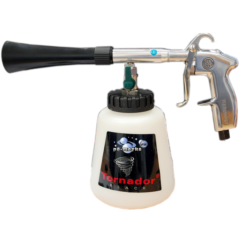 Не хитрая, но надёжная конструкция Tornador может помочь Вам при химчистке автосалона или мягкой обивки кресла и дивана. В чём суть работы: торнадор (точнее шланг в его конусной части) раскручивается на высоких оборотах образовывая воздушную воронку, которая раскрывает поверхность и поры, вытаскивая оттуда застоялую грязь. Аксессуар Торнадор применим ко всем типам обивки авто: кожа и пластик, виниловые и резиновые покрытия, ткань или дерево. Вытягивает из щелей и трудных мест залежавшуюся грязь (возможно и с добавкой химии) или просто продувая турбо воздухом. Для такого аксессуара потребуется компрессор с минимальными двести лиитров за минуту выдаваемого воздуха ну и рабочими 8 атмосферами (если количество Tornador –ов будет выше, то и воздушный нагнетатель должен быть мощнее). Предлагаемые нами для покупки торнадоры: TR (КНР), C (Тайвань), Z (Германия).